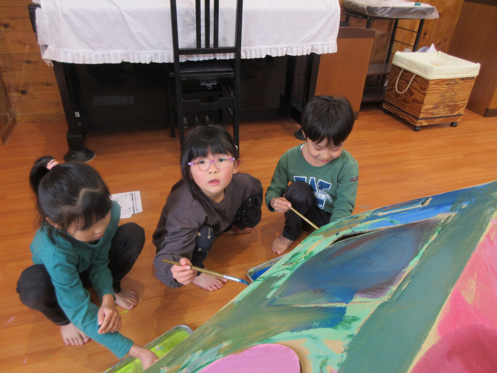 そら組さんで、段ボールを使って巨大迷路を作ったり、段ボールはハウスをつくり色を付けたりして遊びました。